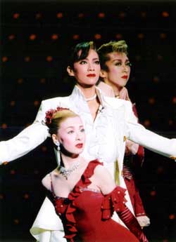 東京では新劇場の開場を祝う舞踊ショーを出したが、宝塚では新作ショー「ESP!!」が、退団するトップスター、真琴つばさ=写真中央=のために特に制作された。