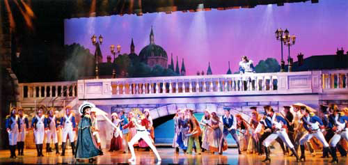 | | ベルサイユ宮殿の運河に浮かべた船で、互いの愛を確かめあうフェルゼン(和央ようか)とアントワネット(花まり)=宙組「フェルゼンとマリー・アントワネット編」 |