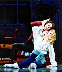 | | アンドレ(水夏希)の愛を受け入れるオスカル(彩輝直)。独特の様式美も『ベルばら』の魅力の一つ。今回はオスカルとアンドレを彩輝と水が役替わり(24日から交替)で演じるのも話題だ。 |