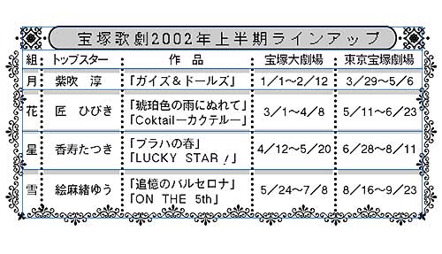 植田伸爾理事長の話 「来年は88周年。人間でいえば米寿です。末広がりの8が並ぶということで、バラエティーにとんだいろいろな作品をお見せしたいなと考えました。それが来年のラインアップのコンセプトです。まずは海外のミュージカル、宝塚の名作、オリジナルもの、現代をあつかった意欲的な作品など。ショー、レビューにはベテラン、若手が腕を競います。今、新しいトップが生まれています。それぞれを、バラエティーに富んだ作品で多くの方々に見ていただきたいと思っています。また、専科の充実のため轟悠を配属し、雪組の轟ではなく、宝塚の轟として各組で活躍の場を広げていきますので、よろしくお願いいたします」
