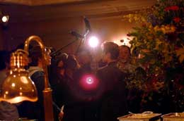 | 会見、および会見後の懇談会のもよう。左は会見後の記念撮影。左下は、轟単独撮影のため、ひな壇から去る朝海が、いたずらっぽい笑いのまなざしを轟に向けたところで、こちらも思わずニッコリの場面。右の4場面はいずれもテレビの取材に応じているところ。 |