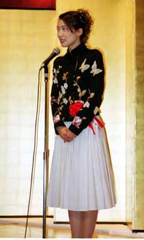 あいさつする松本悠里 大衆演劇を対象にした菊田一夫演劇賞の受賞式が十六日、東京会館(東京都千代田区)で行われ、永年の宝塚歌劇・日本舞踊の貢献に対して宝塚歌劇団専科の春日野八千代、松本悠里に特別賞が授与された。 宝塚の現役生が受賞するのははじめて。 春日野の代理で出席した宝塚歌劇団の植田紳爾理事長が、「洋楽で踊る日本舞踊洋は、先人たちが培ってきた宝であり誇りに思う。思いがけなく賞を頂き大変うれしく思います。健康の都合で出席できないことを残念に思う」と春日野の手紙を代読した。 松本は「菊田一夫先生には宝塚の作品をつくっていただていますが、初めてお仕事させていただいのは研二(入団二年目)で、雲の上の先生でした。日本舞踊とは縁のない賞と思っておりましたし、その先生の名前のついた賞を頂くなんてこれもまた夢のよう。宝塚歌劇団の日本舞踊の道を精進したい」と話した。 大賞はミュージカル『エリザベート』のスタッフ・出演者一同に贈られた。