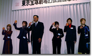 会見後のパーティーで、小林公平・阪急電鉄会長の音頭で乾杯するスターたち