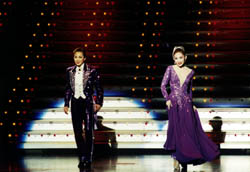 これまで幾組ものコンビが客席を沸かせてきた宝塚伝統の名場面を、二人は定番のグリーンでなく、紫の衣装で踊った。憂愁と気品が持ち味のコンビ、最後のダンスはアダルトな色合いで締めくくった。
